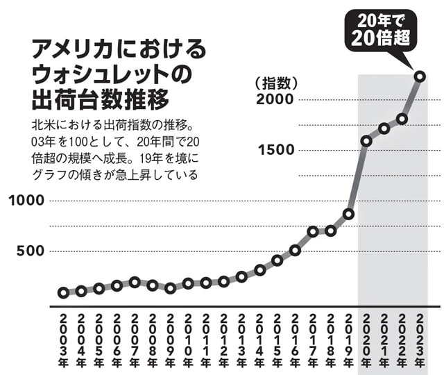 米国におけるウォシュレット(温水洗浄便座)販売台数は、コロナ禍を契機とした衛生意識の高まりや紙不足、セレブによるSNSでの口コミなどを背景に、2020年に前年の1.8倍と販売が急拡大。今も右肩上がりで成長を続け、シートタイプでは日本市場の3分の1の出荷台数になる月もある。