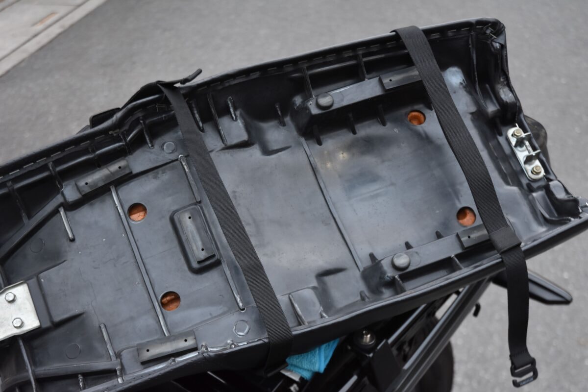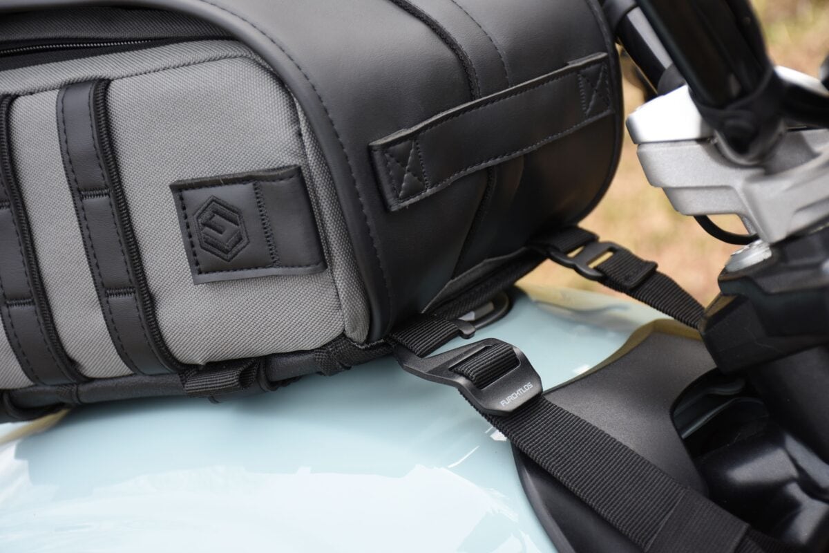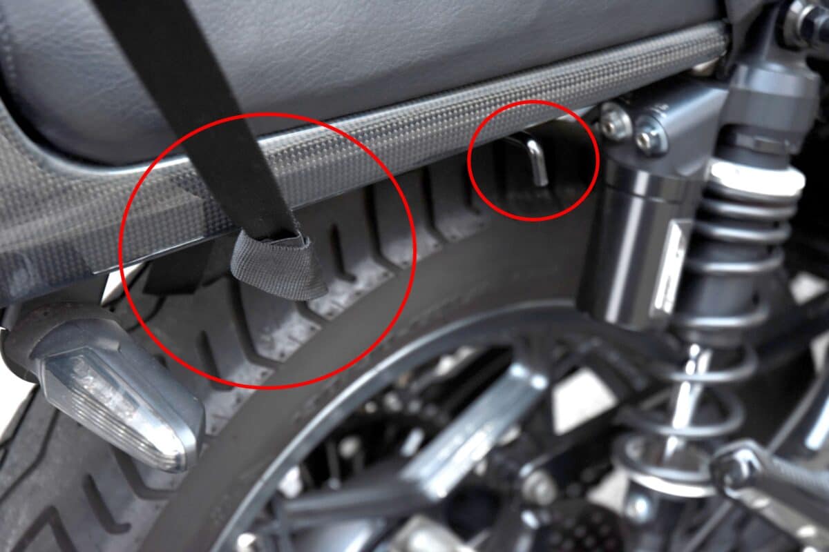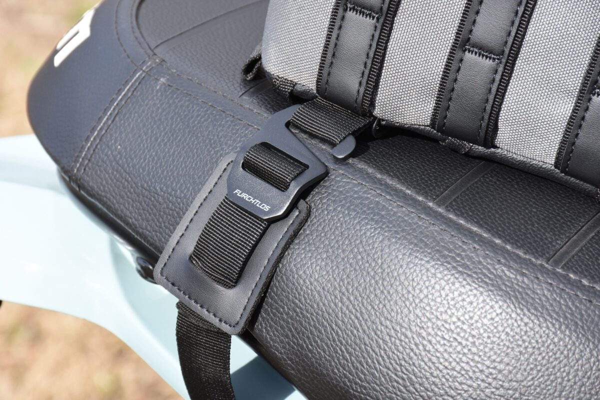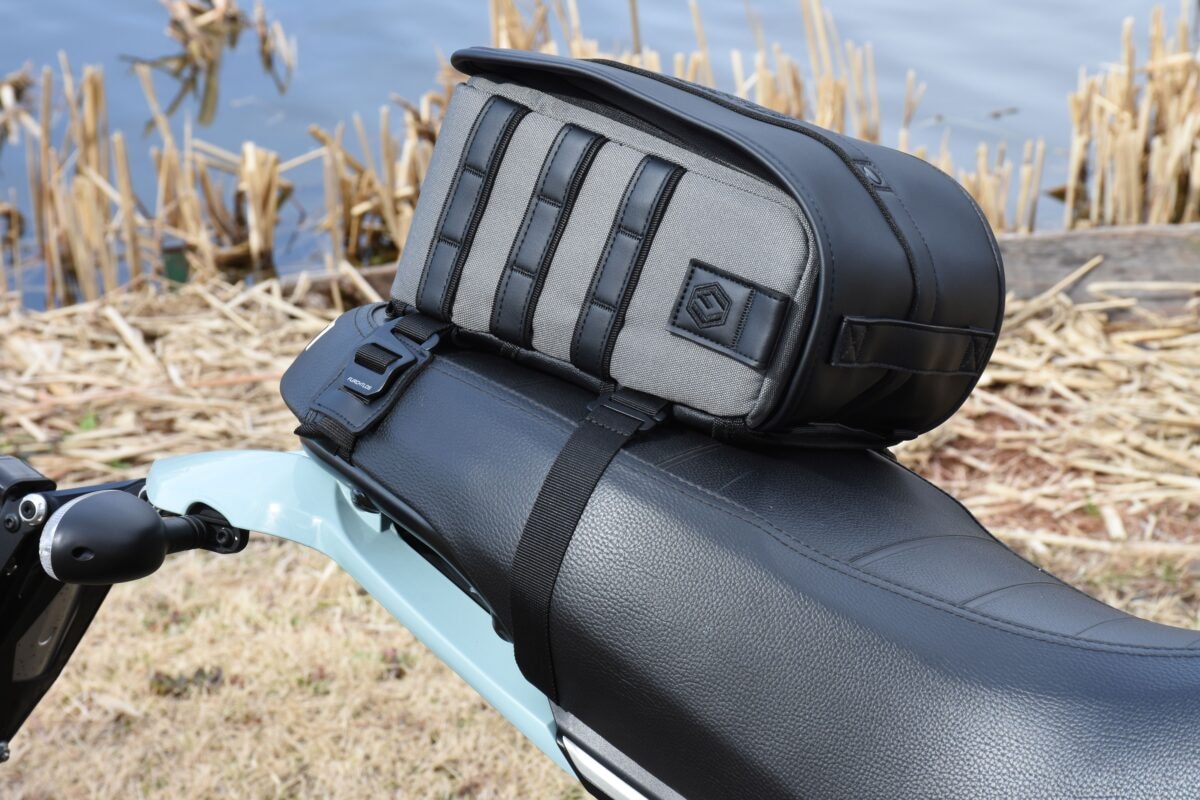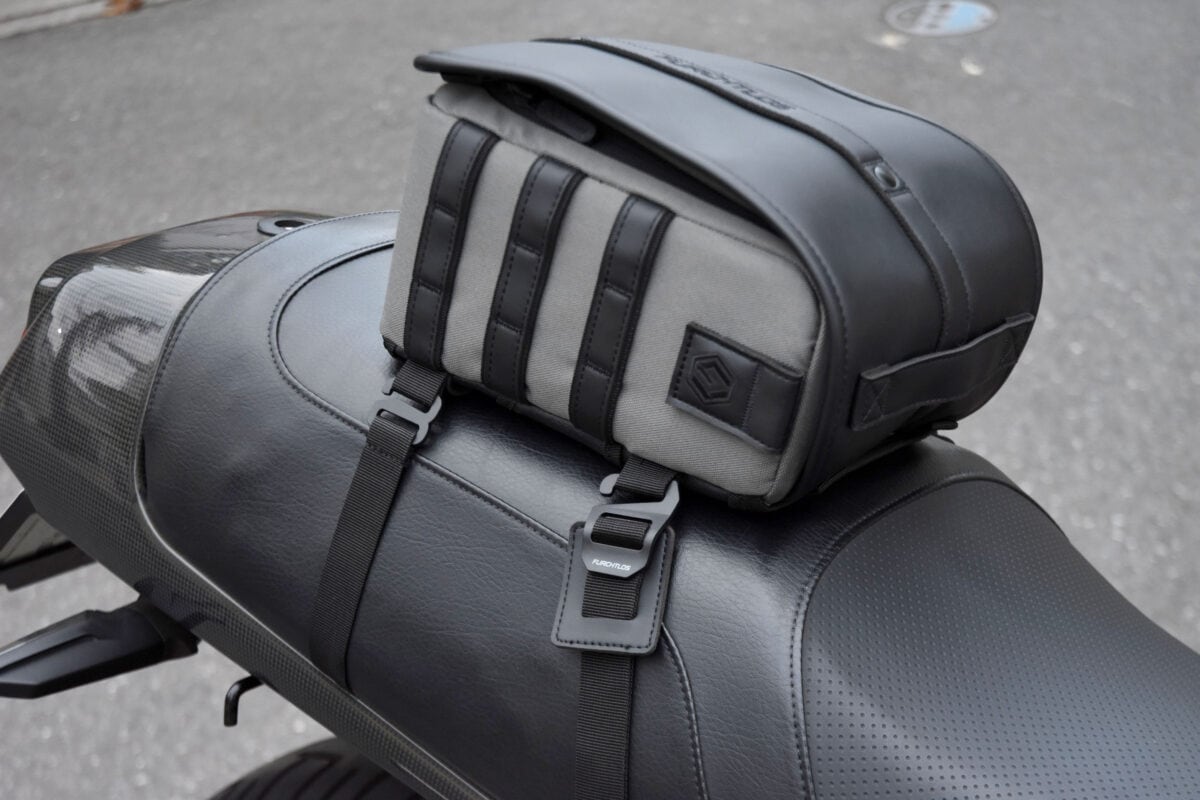 タンクバッグが、バイクのスタイリングを邪魔してしまうな、と感じるならば、リアシートに固定してシートバッグとして使用することもできる。シート下にストラップを通したり、荷かけフックからストラップを伸ばしたりと、ここでも固定方法の自由度が高く、取り付け方法も簡単。