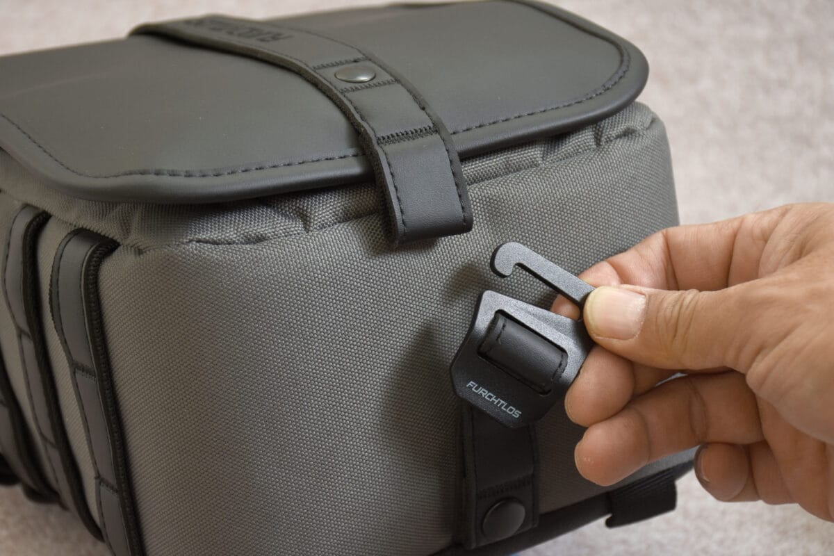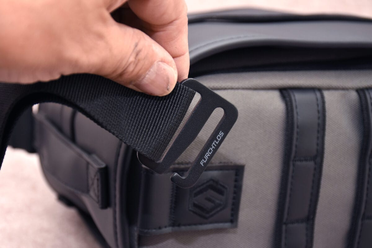 バッグのボディあちこちに、デザインの一部にもなっているループ状ウェビングがあり、そこにGフックで固定するだけ。