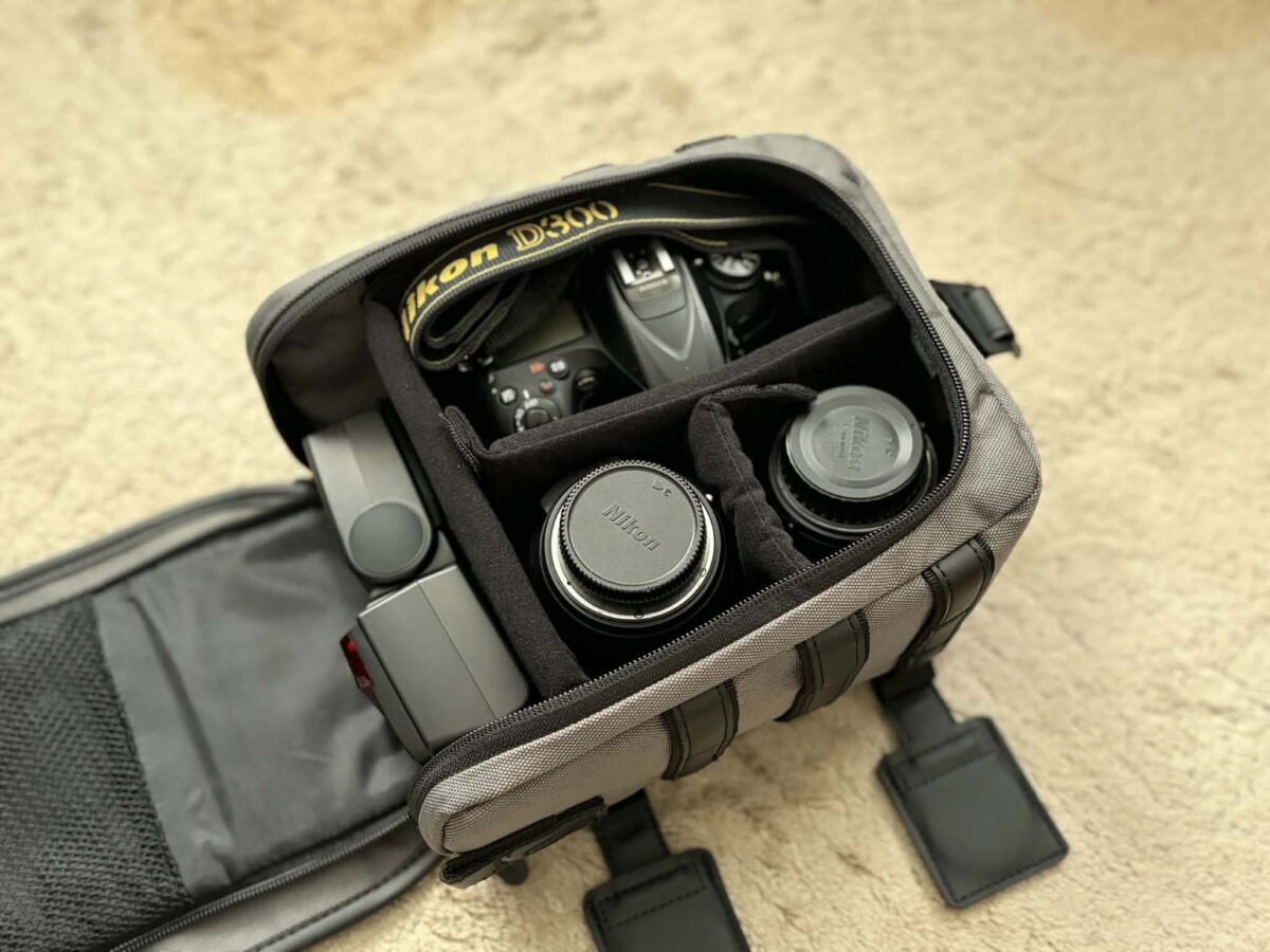 メインのスペースには、このページで使用したカットの撮影のために一眼レフ、レンズ、ストロボを収納。内部スペースと仕切り板にはクッション材が貼りめぐらされていて、傷つき防止も考えてくれているのがうれしい。さすが、バイク乗りが考えた、バイク乗りのためのアイテムだ。