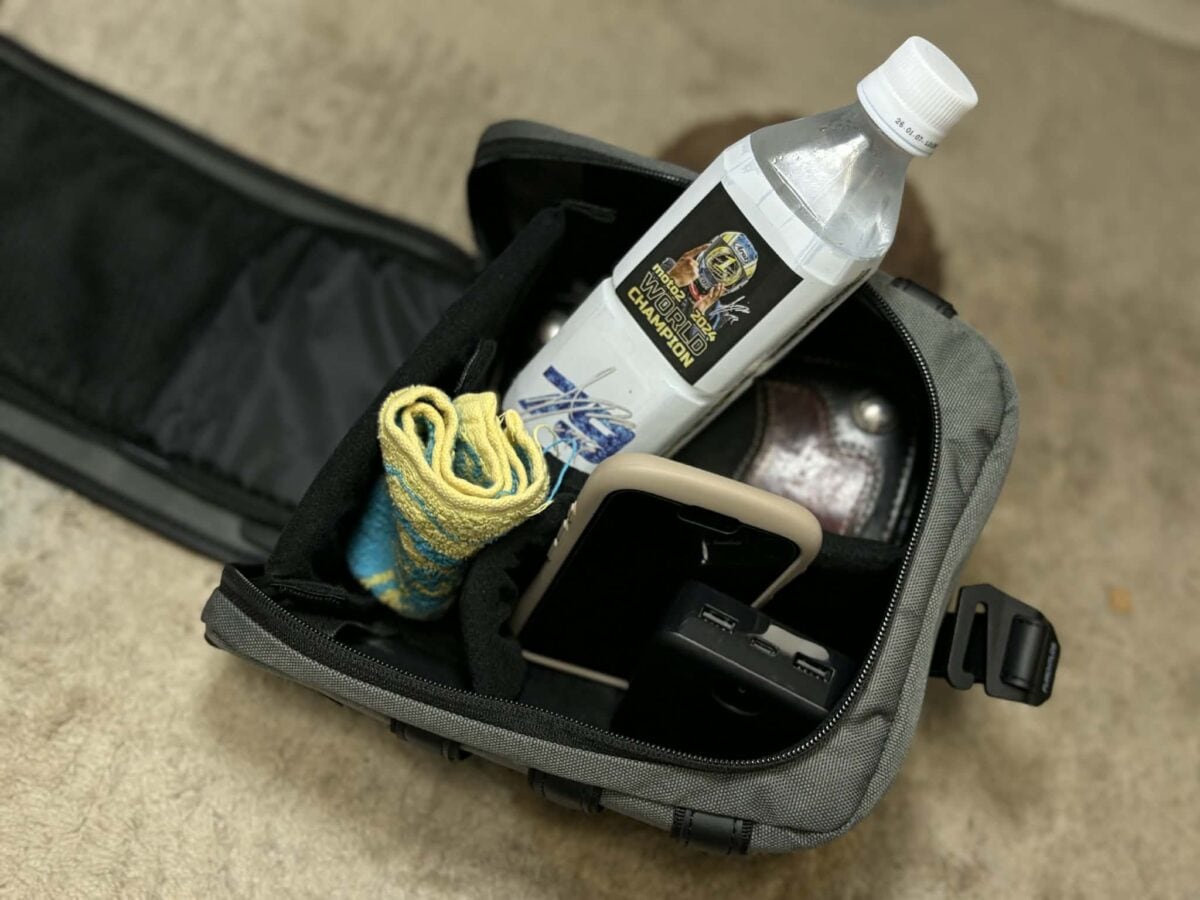 固定してある状態でトップカバーのフラップを開ければ、約5Lのスペースが顔を出す。ボディ本体も防水ナイロンレザーで、メインスペースの開閉にも止水ファスナーが使用されていて、急な雨にも対応できる。雨が激しくなってきたら、専用のレインカバーも付属されている。