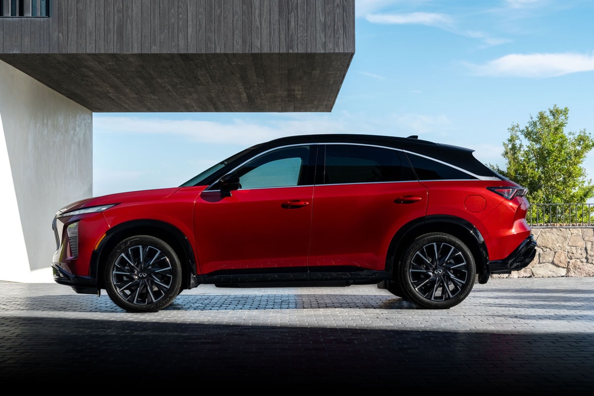 エクステリアはインフィニティのヘリテージを受け継ぎ、そのデザインランゲージ「Artistry in Motion」を進化させている。大きく弧を描くルーフラインと、ワイドで引き締まったスタンスが、強い存在感を生み出している。四隅に配置されたホイールは、安定感と高いパフォーマンスを視覚的にも訴求している。