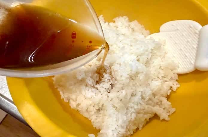 炊きたてのご飯にすし酢を回しかけ、しゃもじで切るように混ぜて酢飯にします。