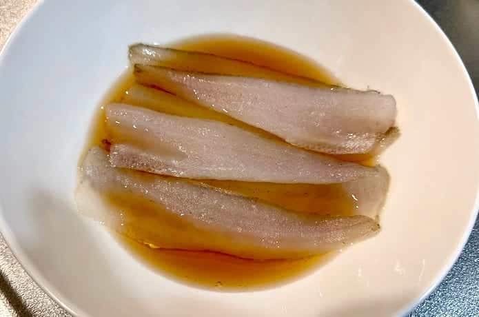 ②出てきた水分をキッチンペーパーで拭き取り、きび酢に30分ほど漬けます。