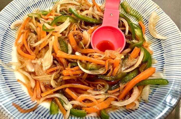 薄切りにした玉ねぎ、にんじん、ピーマンに塩を振り、30分置いて水気を軽く絞ってから南蛮ダレに加えます。