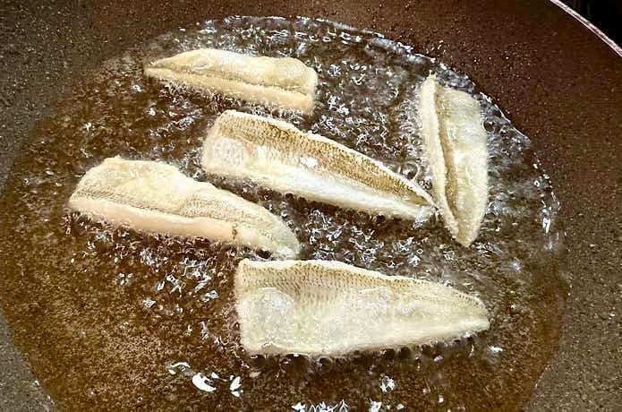 米粉をまぶし、170〜180℃の油で揚げます。小型のシロギスは二度揚げにすると骨まで食べやすくなるのでおすすめです。