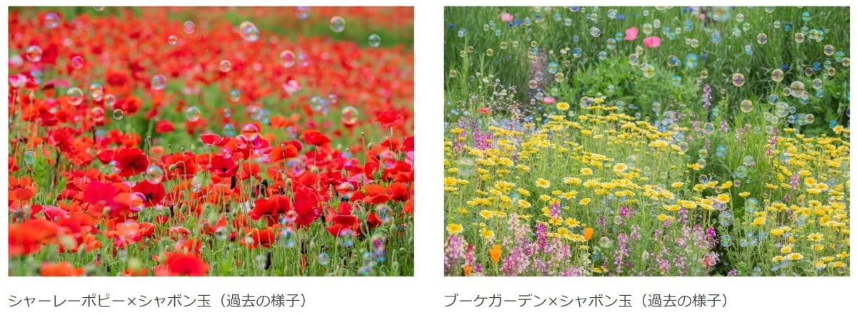 毎年大人気なのが「シャボン玉のフォトジェニックタイム」です。花畑にたくさんのシャボン玉が飛ぶ幻想的な風景は写真映え間違いなし。