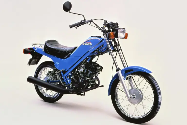 ラクーンは異端という言葉がピッタリなモデルです。発売されたのは1980年3月1日。「市街地を軽快に走るレジャーバイク」というコンセプトで、スポーツ原付MB50をベースに開発されました。