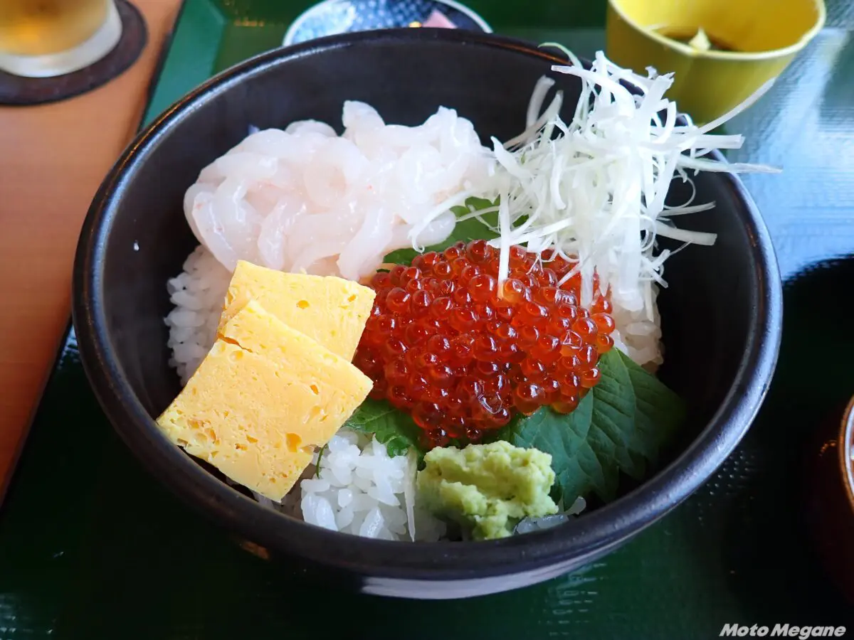 港から10分ほどの場所にある道の駅では、特産の白エビを楽しめる。レストランや食堂では白エビと使った料理を提供。レストランでは白エビかき揚げ丼や、白海老刺身丼、刺身とかき揚げが両方食べられる「新湊御膳」など、白エビ料理を堪能できるのだ。食堂では白エビを練り込んだオリジナルの麺を使ったラーメンが人気だ。