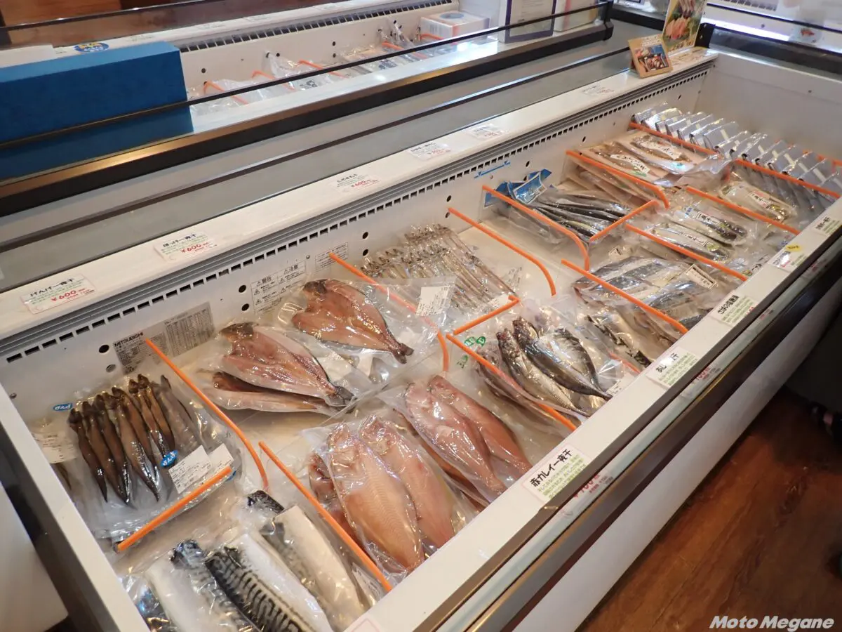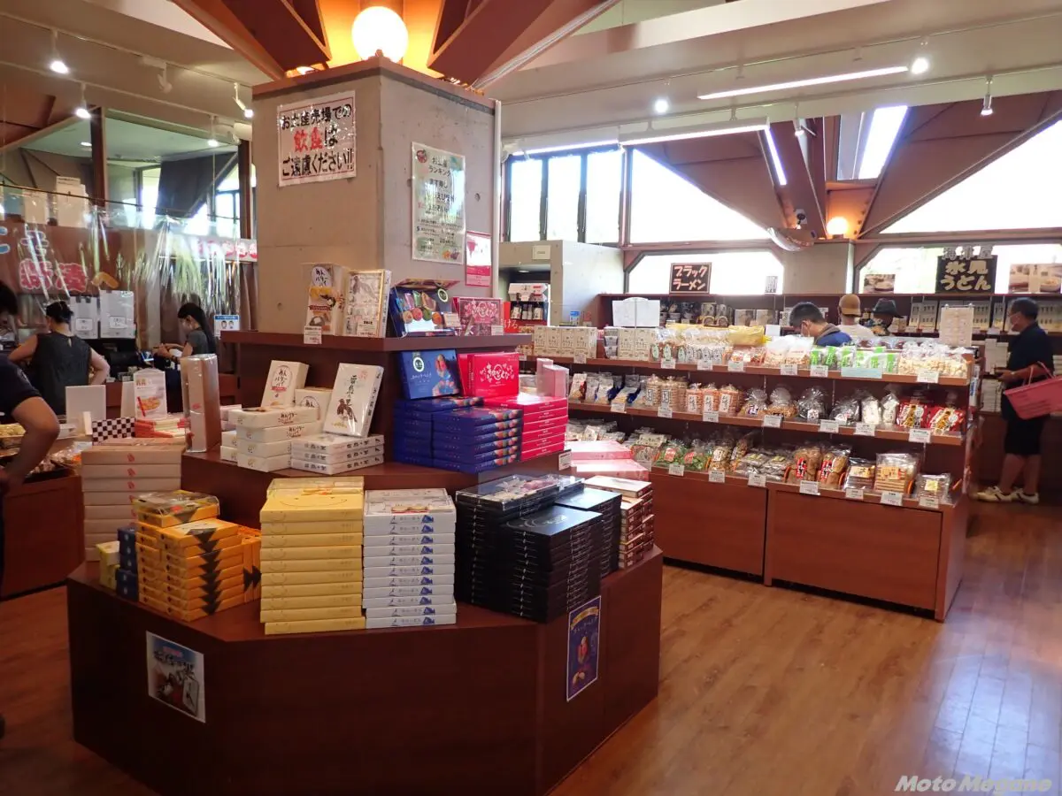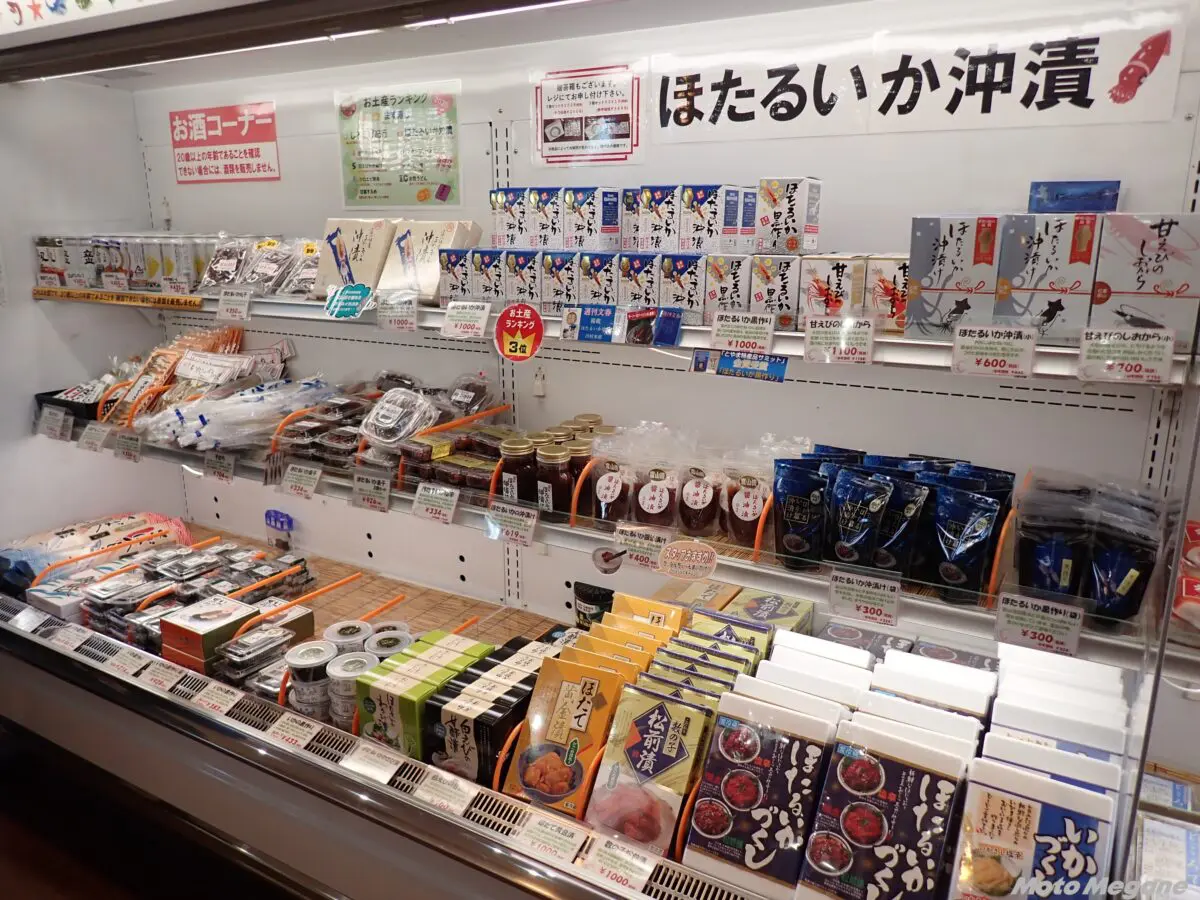 物産販売コーナーでは、白エビを使ったさまざまな商品を販売。冷蔵品から、せんべいなどの土産品まで種類が豊富。白エビ以外にも富山湾名物のホタルイカ商品や、海産物を中心に富山県や地元の特産品、道の駅オリジナル商品などが数多く揃う。
