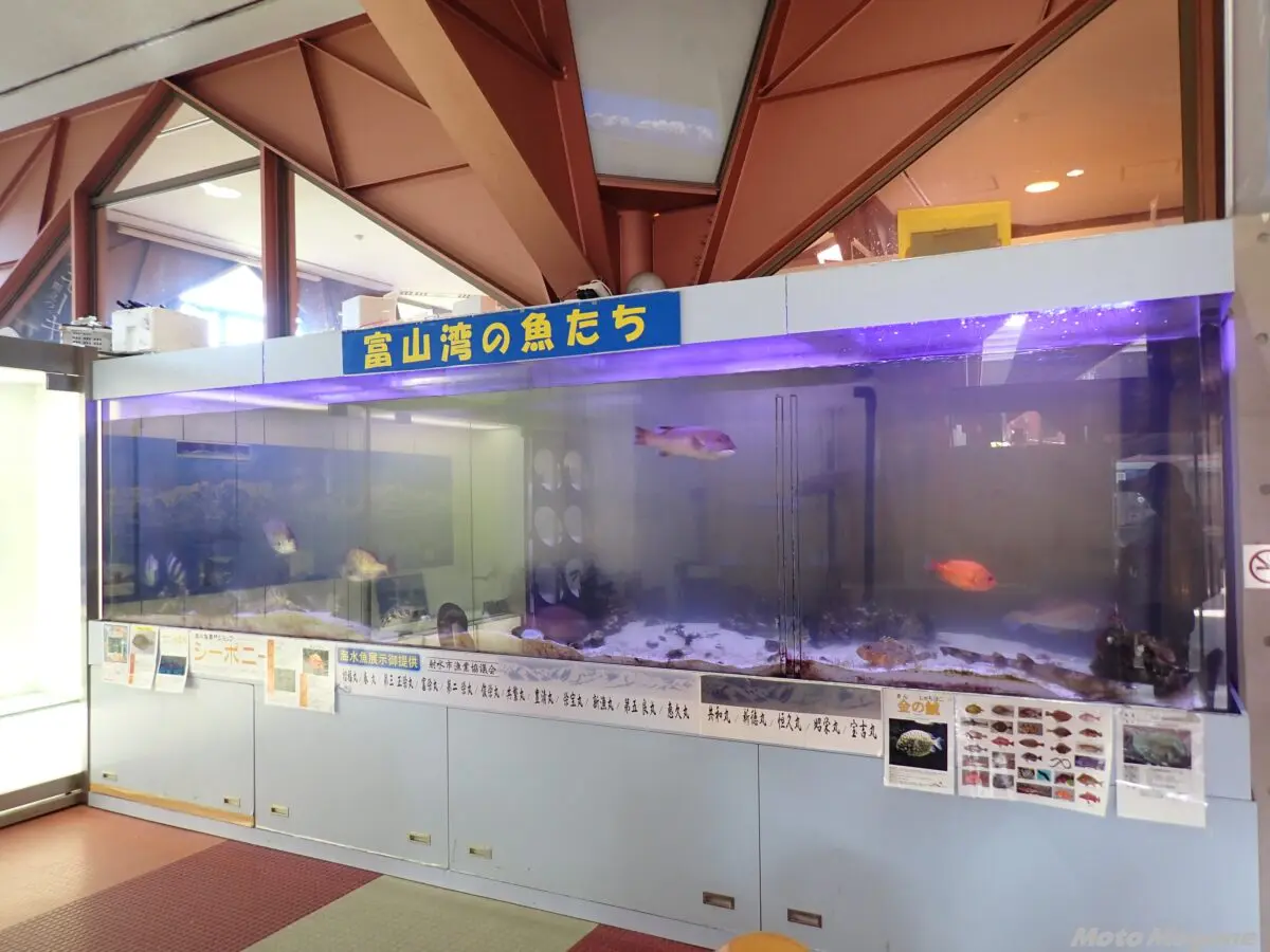 展示コーナーにある横5m、高さ1.2m、奥行き80cmの大型水槽では富山湾に棲む季節の魚が泳ぎ、4月から10月末頃までは白エビの展示も行なわれる。