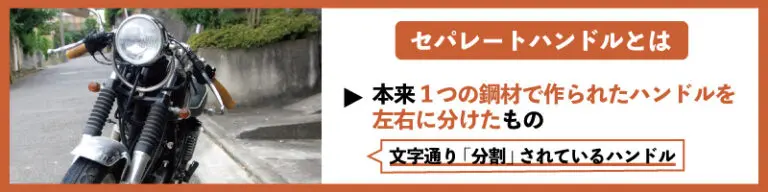 セパレートとは英語で分けるという意味で、本来1つの鋼材で作られたハンドルを左右に分けているものをセパレートハンドルと言います。ライダーの間では、セパレートハンドルはしばしば略して「セパハン」と呼ばれ、親しまれています。またセパレートハンドルは、左右のハンドルが左右のフロントフォーク部に環状に取り付け固定されます。