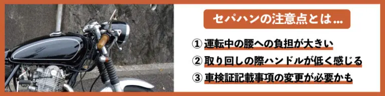 セパハンにすると、ライディングポジション・コーナリングなどに変化がありますが、カスタムに伴いバイクに乗っている間は前傾姿勢が続き腰への負担が大きくなるデメリットが生じます。