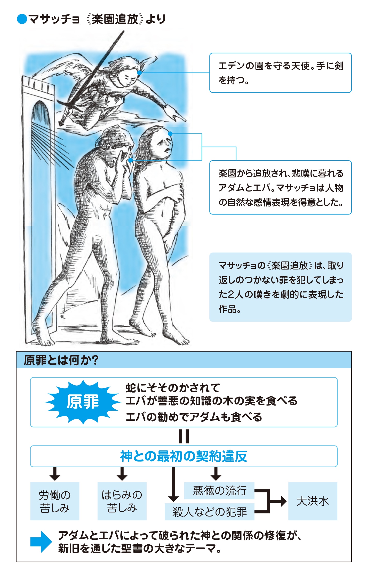 これ以降、アダムとエバの子孫である人間は生まれながらにしてこの罪を負っているとされ、ここから*原罪(げんざい)とも呼ばれます。