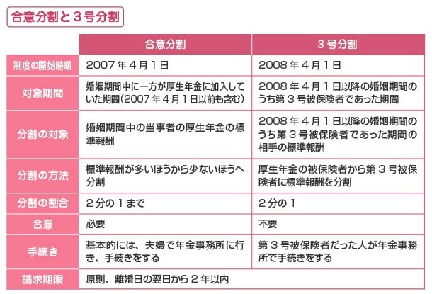 ポイント 年金分割を受ける側が専業主婦(夫)などの第3号被保険者の場合は3号分割、それ以外の場合は合意分割が適用される。 将来のためにやっておこう! 年金分割の比較 合意分割と3号分割