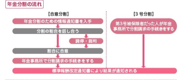制度の開始時期:2008 年 4 月 1 日 対象期間:2008 年 4 月 1 日以降の婚姻期間のうち第 3 号被保険者であった期間 分割の対象:2008 年 4 月 1 日以降の婚姻期間のうち第 3 号被保険者であった期間の相手の標準報酬 分割の方法:厚生年金の被保険者から第 3 号被保険者に標準報酬を分割 分割の割合:2 分の 1 合意:不要 手続き:第 3 号被保険者だった人が年金事務所で手続きをする 請求期限:原則、離婚日の翌日から 2 年以内 年金分割の流れ