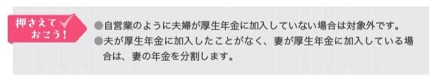 自営業のように夫婦が厚生年金に加入していない場合は対象外です。 夫が厚生年金に加入したことがなく、妻が厚生年金に加入している場合は、妻の年金を分割します。【出典】『増補改訂版 前向き離婚の教科書』著:森元みのり