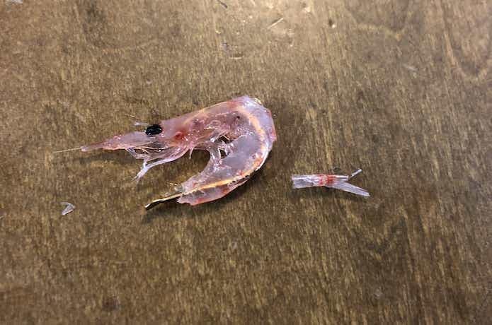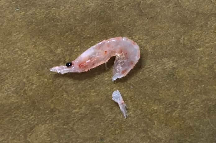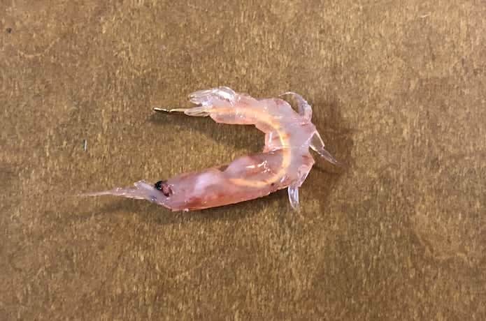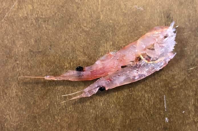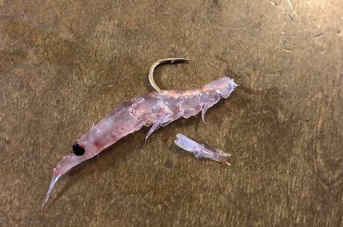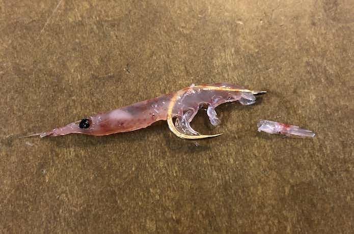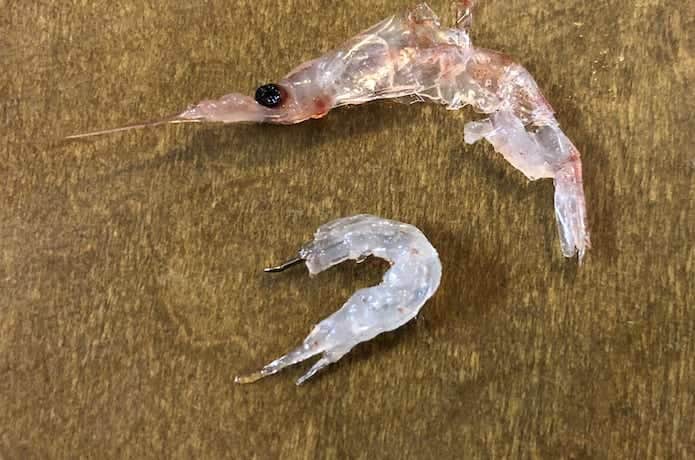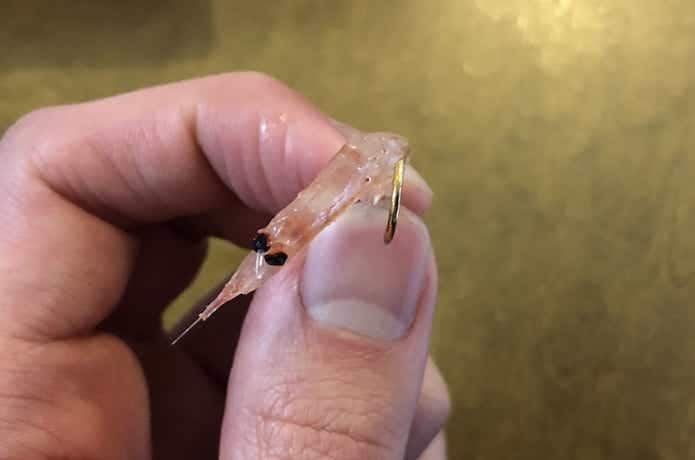 オキアミを鈎に付ける際は、まず尻尾を取りましょう。尻尾があると、尻尾が水の抵抗を受けて回転してしまうのです。