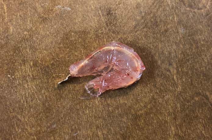 最も簡単な付け方で、切った尻尾の部分から鈎を入れて腹側から鈎を抜く方法です。