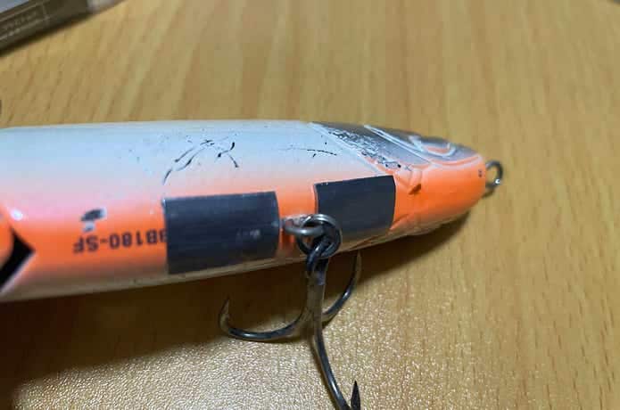 海水の足場が高い場所では、手前が探りづらくなるため、ウェイトを貼っています。