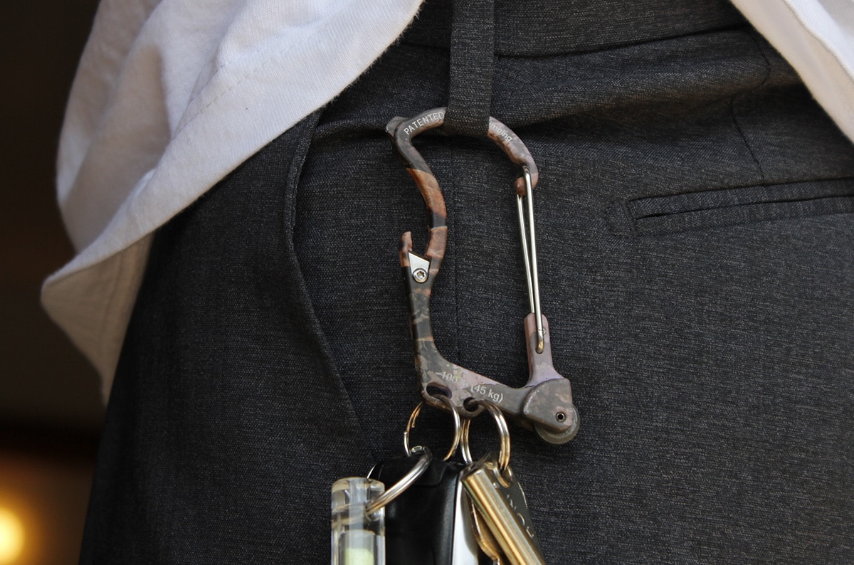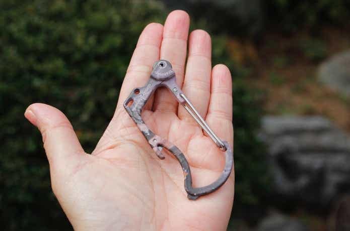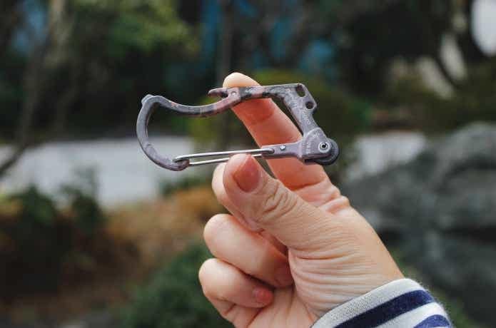 よくあるカラビナのように見えるこれ。じつはちょっと意外なことができるんです。まずはこちらをご覧あれ。