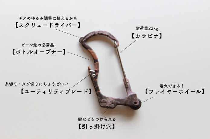 そんなブランドが作ったのが、この「ファイヤービナー」。見た目はカラビナですが、全部で6つの機能を搭載しています。
