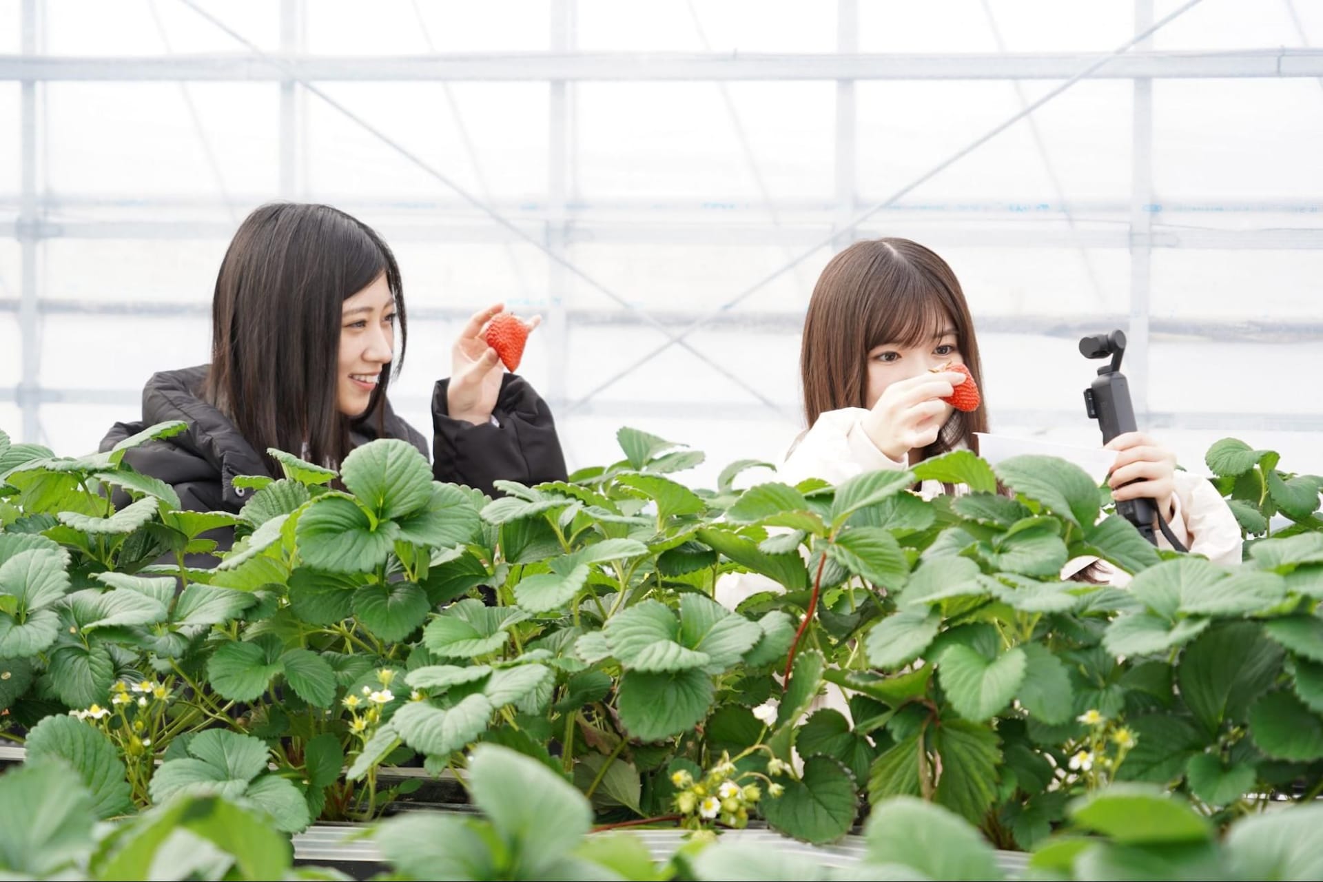 味わった後は、5期生・小川彩がやりたかったいちご狩りに向かった。6期生・川端晃菜は、「嬉しい。私“狩り”初めてなんですよ」と言う。「今まで何狩りしました?」と小川に尋ねる川端。小川はいちごをはじめ、さくらんぼ、桃、トマト、りんご、ぶどう…とさまざまな果物狩りの経験があるようだ。川端は「すごい、プロ狩り!」と言って、小川に尊敬の眼差しを向けた。