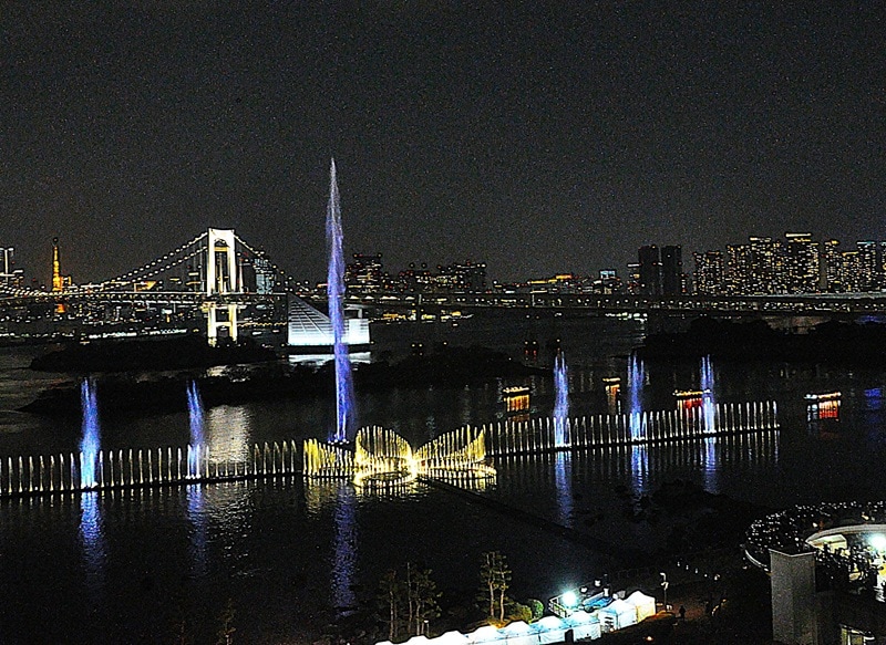 噴水ショー「東京アクアシンフォニー」は、東京都が臨海副都心の新たなランドマークとしてお台場海浜公園(東京都港区)に噴水施設を設け3月28日夜から開始した。毎日原則11時から21時頃まで1時間ごとに各回10分程度行う計画だ。都によると、年間の運営費は2億円で、年間約3000万人が噴水ショーを楽しむと見込んでいる。