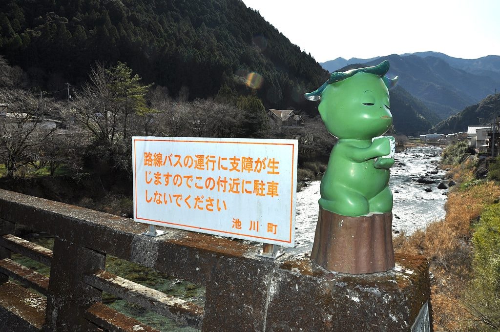 仁淀川水系土居川沿いの旧池川町(現在は合併して仁淀川町)に入ると、長い橋の欄干近くで外国人観光客の二人組が自撮りしている。川幅は広く、遠くの山も見える見晴らしの良い場所である。欄干の端にちょこんと座る河童のようなキャラクター像が味わい深い。
