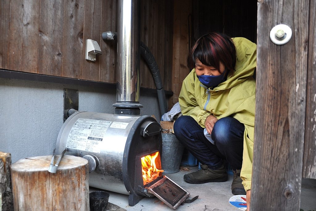 宿のひのき風呂はまきでたく。「やったことがなかったから、最初は難しくて苦労しました。たきすぎたり、ぬるま湯だったり」とまきの燃え具合を見ながら、古城さんは言う。今はパートナーが風呂たきを手伝ってくれる。いい湯加減になるにはおよそ1.5~2時間ほどかかる。しかし宿泊者の中にはその手間のかかる、まき割りや火の世話をやりたがる人もいるという。目の前を流れる仁淀川水系の土居川のせせらぎを聞きながら、眺める赤い火は格別だろう。風呂がたきあがるまでのゆったりとした時間を楽しむ。湯船の中でもゆっくりと時が流れているような感覚に心地よさを感じた。