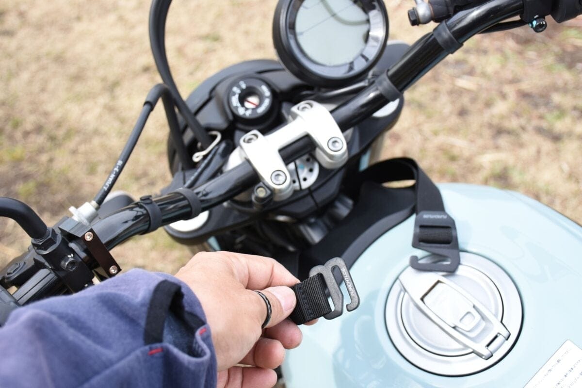 今回は、筆者の愛車・1100Sカタナに取り付けて走ってみたけれど、高速道路を走った時もマグネット固定はガッチリと安定していて、心配ならばステアリングヘッドからストラップを伸ばしてもいいな、と思うくらいだった。