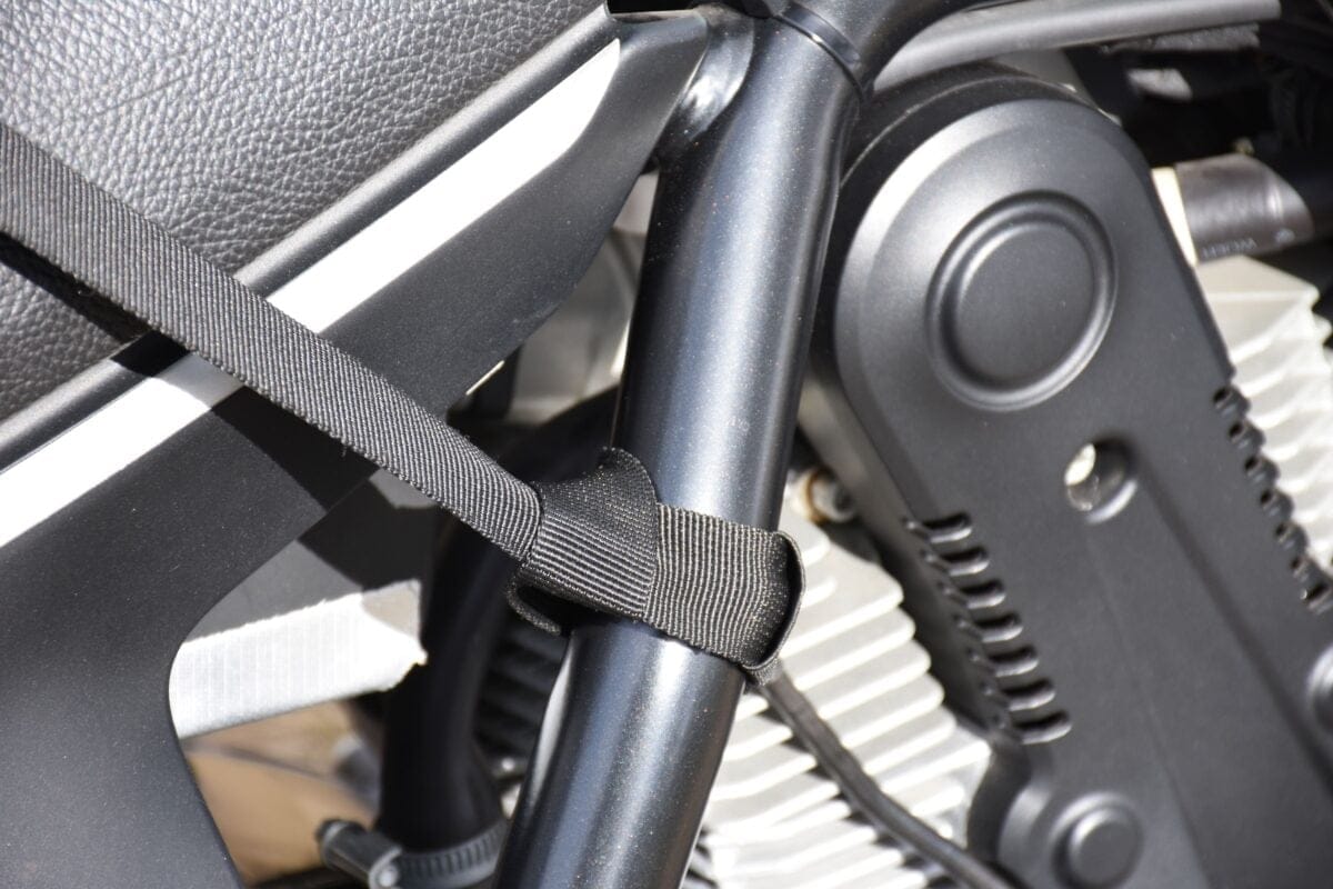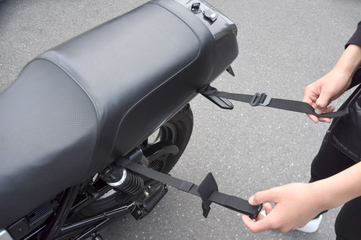 タンクバッグが、バイクのスタイリングを邪魔してしまうな、と感じるならば、リアシートに固定してシートバッグとして使用することもできる。シート下にストラップを通したり、荷かけフックからストラップを伸ばしたりと、ここでも固定方法の自由度が高く、取り付け方法も簡単。
