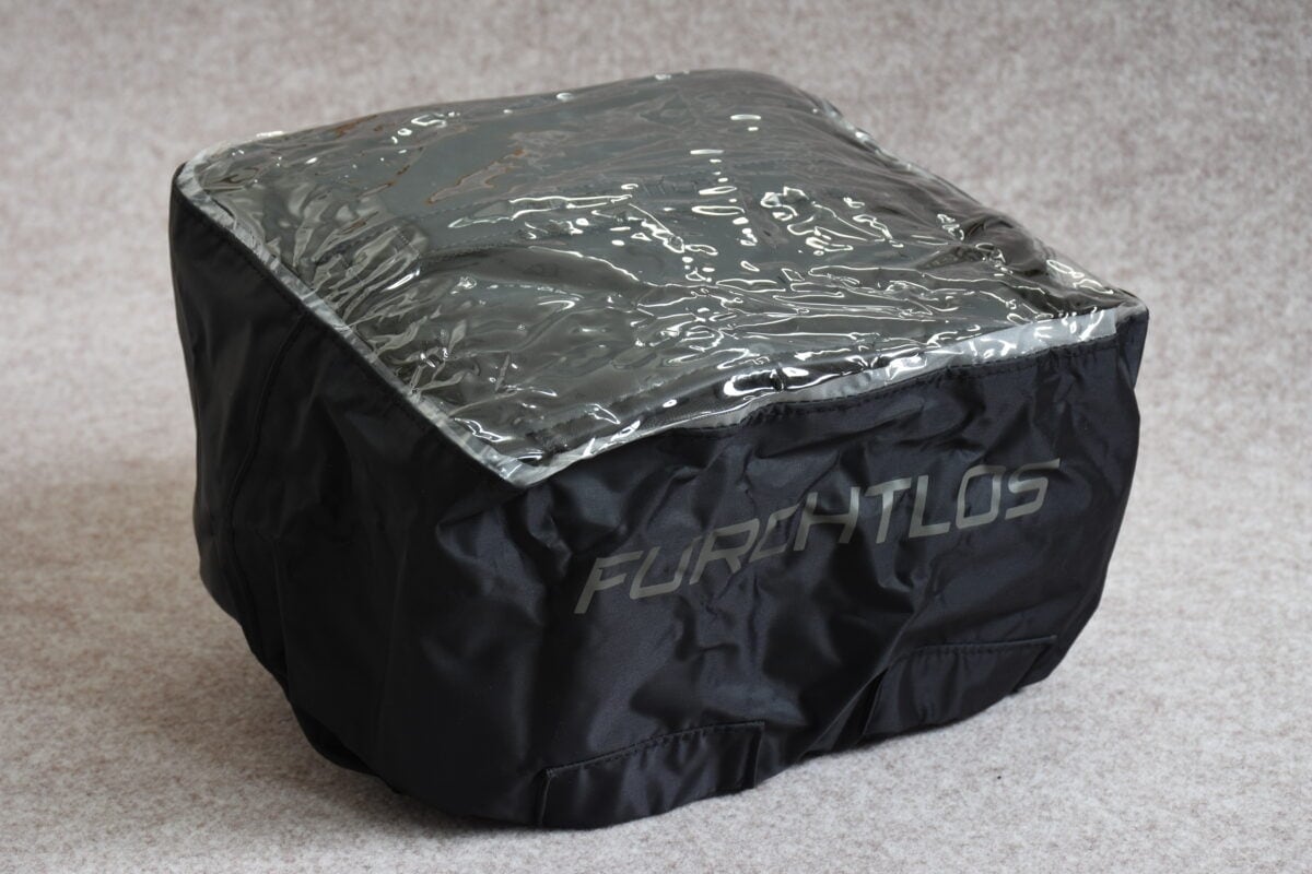 固定してある状態でトップカバーのフラップを開ければ、約5Lのスペースが顔を出す。ボディ本体も防水ナイロンレザーで、メインスペースの開閉にも止水ファスナーが使用されていて、急な雨にも対応できる。雨が激しくなってきたら、専用のレインカバーも付属されている。