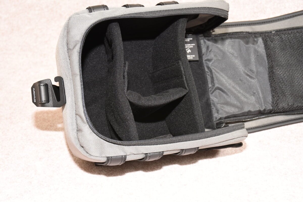 メインのスペースには、このページで使用したカットの撮影のために一眼レフ、レンズ、ストロボを収納。内部スペースと仕切り板にはクッション材が貼りめぐらされていて、傷つき防止も考えてくれているのがうれしい。さすが、バイク乗りが考えた、バイク乗りのためのアイテムだ。