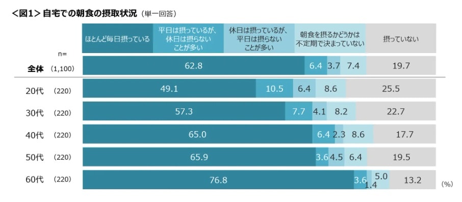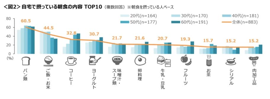 全国の20~69歳の人を対象に3月20日に調査を実施、1100件の回答をまとめたもの。年代が上がるにつれて毎日朝食をとる割合は高くなり、60代では76.8%。20代は49.1%にとどまる。主食は「パン類」(60.5%)が最も多く、「ご飯・お米」は44.5%。「毎日決まったメニューを食べている」人が45.5%。「手軽にすぐ食べられる簡単なものを選んでいる」「気に入るとずっと食べ続けるメニューがある」が2割前後。忙しい朝の時間、毎日異なる献立を考える余裕はなかなか持てないようだ。
