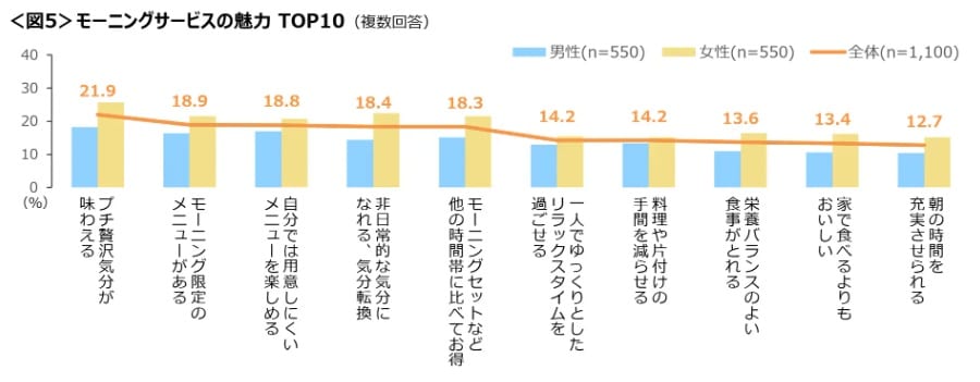 もっとも、たまには外でモーニングサービスを楽しむという人も。いつもと違う中身、家ではめったに作らないものを食べれば、プチぜいたくな気分を味わえる。モーニングサービスの魅力についてはこの「プチぜいたく気分が味わえる」がトップ。「モーニング限定のメニューがある」「自分では用意しにくいメニューを楽しめる」「非日常的な気分になれる、気分転換」などが上位だった。