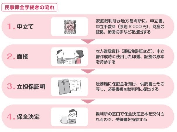 法的な離婚や慰謝料原因理由があり、相手が財産を隠している証拠があれば、いつでも家庭裁判所または地方裁判所に申し立てることができる。認められると、仮差押え、仮処分を命じる。手続きには保証金が必要で、高額になることがある。