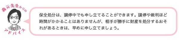 【森元先生からのアドバイス】保全処分は、調停中でも申し立てることができます。調停や裁判ほど時間がかかることはありませんが、相手が勝手に財産を処分するおそれがあるときは、早めに申し立てましょう。
