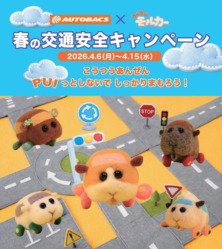 同キャンペーンは、「令和8年 春の全国交通安全運動」に合わせて展開され、人気アニメ『PUI PUI モルカー』とのコラボによる安全啓発企画を実施する。あわせてタイヤやバッテリーなど5項目を点検する無料安全点検の利用促進や、リサイクル素材を使用したオリジナルファイルケースの配布も行う。幅広い世代に向け交通安全意識の向上を図る取り組みとなる。