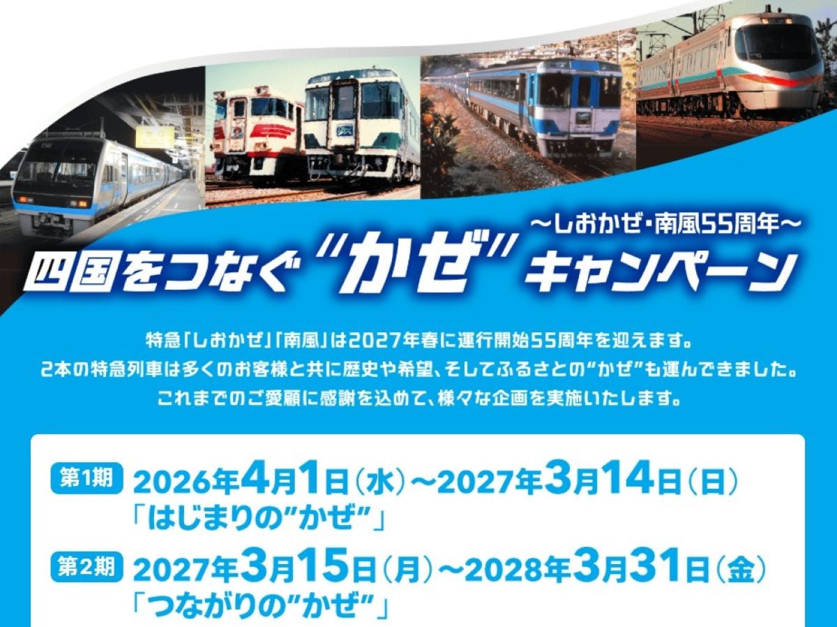 JR四国は、2027年3月15日に特急「しおかぜ」「南風」が運行開始55周年を迎えることを記念し、2026年4月1日から「四国をつなぐ“かぜ”キャンペーン」をスタートします。2028年3月末までの約2年間にわたり開催されるこのキャンペーンでは、デジタルスタンプラリーやInstagramでの写真投稿企画、さらにお得なチケットレス特急券の発売など、四国を五感で楽しむための材料が数多く用意されています。