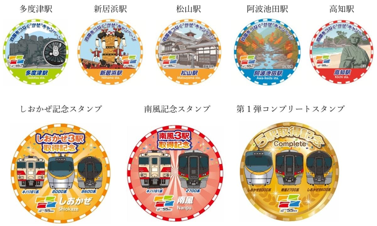 スタンプラリー対象駅: 多度津駅、新居浜駅、松山駅、阿波池田駅、高知駅