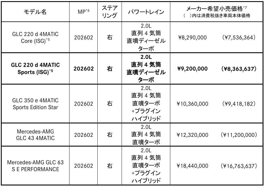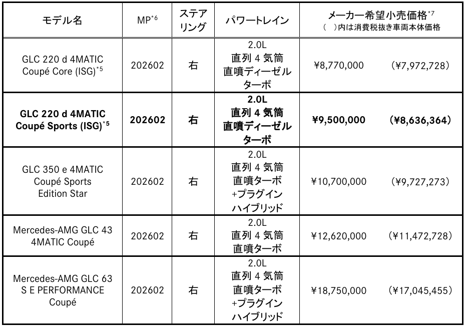 「GLC 220 d 4MATIC Sports (ISG)*1」、「GLC 220 d 4MATIC Coupé Sports (ISG) *1」を追加