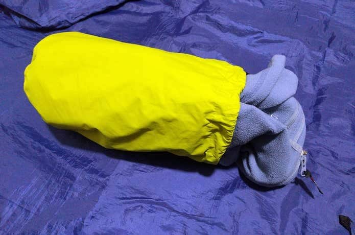 テントで寝るときは、できれば枕が欲しいもの。でも、わざわざ枕を持っていくのはかさばるし重い……。そんな人におすすめなのが、スタッフバッグを簡易枕にする裏技。中身を出したスタッフバッグにウェアやタオルなどを詰め込めば、別途、エアー枕などを携帯する必要はなく、荷物を少なくすることができます。