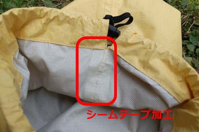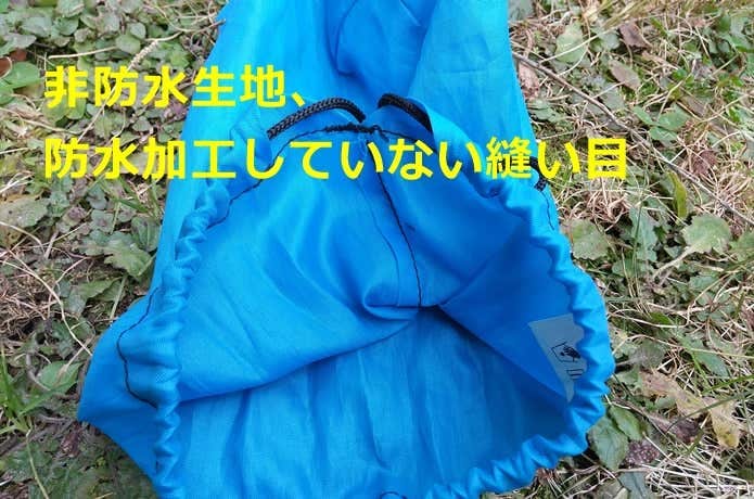 防水生地を使用し、縫い目をシームシール加工や溶着で防水していますが、開口部から水が侵入する可能性がある“巾着型”になっているタイプです。