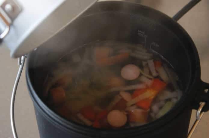 夕飯はラーメンという選択肢もあり。まずCOOKER-1でお湯を沸かして先に野菜を茹で、そのあと乾麺を投入します。