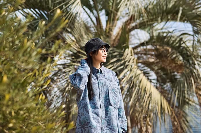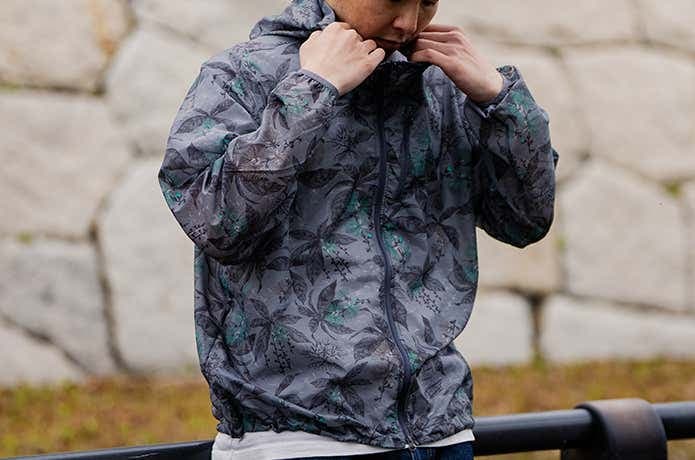 防風性や透湿性を備え、旅先での急な天候変化にも対応する頼れる一着。西表島トリップから着想を得たオリジナルテキスタイルが、フィールドに映えます。
