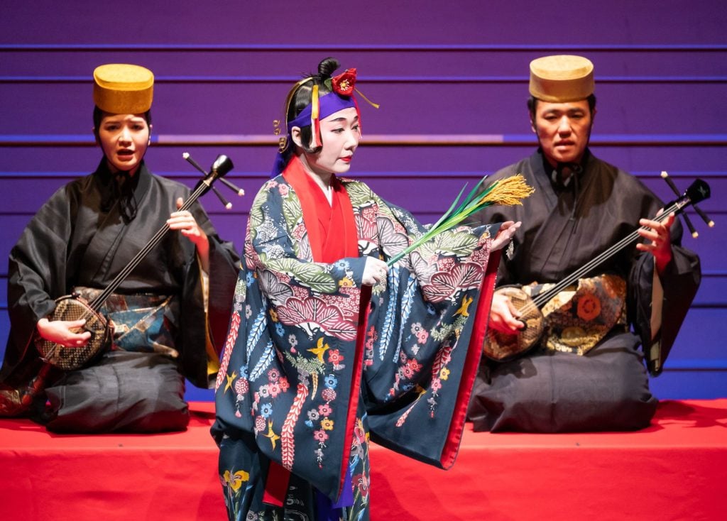 舞台では、次世代を担う実演家たちにより、琉球古典音楽、沖縄民謡、沖永良部民謡、八重山古典民謡・古謡の四つのジャンルが披露された。古典の独唱「赤田風節」(歌三線・親川遥)の静ひつな節回しから、舞踊「稲まづん節」(舞踏・山里静香/歌三線・新垣俊道、親川遥)の優美な踊り、民謡「廃藩ぬ武士」(歌三線・仲宗根創)の時代に翻弄される悲しさ、民謡「ひやみかち節」(歌三線・仲宗根創/太鼓・豊里美保)の民衆の力強さ、沖永良部民謡「永良部百合の花」(歌三線・前田博美/太鼓・豊里美保)の本土の民謡を感じさせるこぶし、そして八重山古謡「とうばらーま」(歌三線・小渡大海/囃子・豊里美保/笛・新垣俊道)の哀愁漂うしみじみとした響きまで、それぞれの「しま」が育んできた音色がホールを彩った。聴衆は、第一部で学んだ楽器の構造や職人のこだわりを念頭に置きながら、一音一音に込められた歴史の重みと、未来へ向かうエネルギーを感じ取っていた。