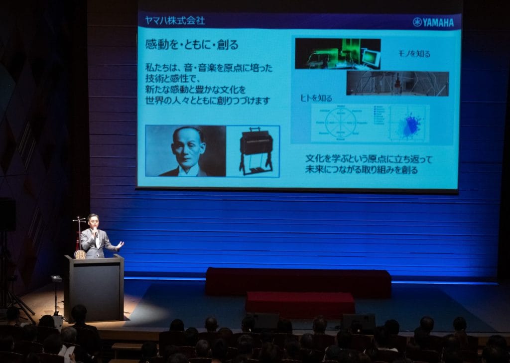 終盤には、沖縄県立芸術大学准教授の新垣俊道氏と、ヤマハ執行役員の杉山啓子氏、三線組合の仲嶺幹氏が登壇しあいさつ。新垣氏は、三線が人々の暮らしや精神文化と密接に結びついた、沖縄人のアイデンティティーを保つ存在であることを再確認し、根底にある精神性を次世代に受け渡していきたいと決意を表明。