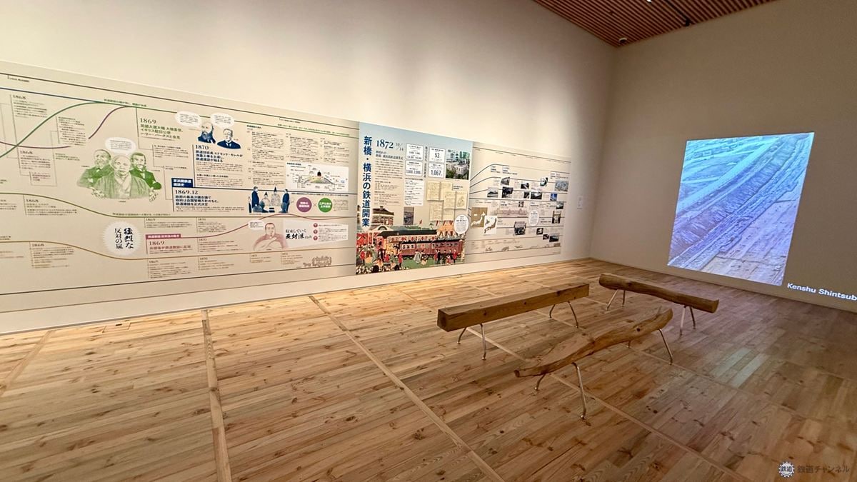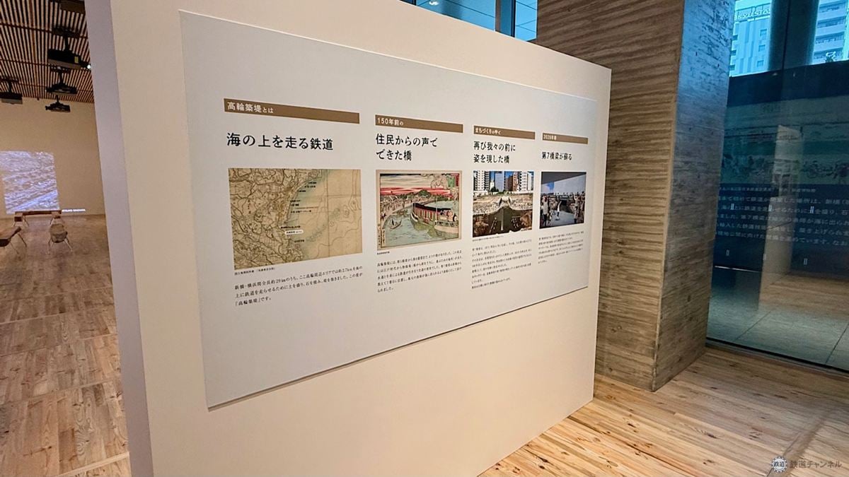 1階ギャラリーでは、日本初の鉄道が走った歴史を未来につなぐ取り組み「THE FIRST RAILWAY PROJECT」のひとつとして、高輪築堤の保存と活用を目的とした展示を行っています。