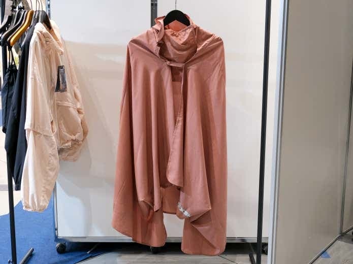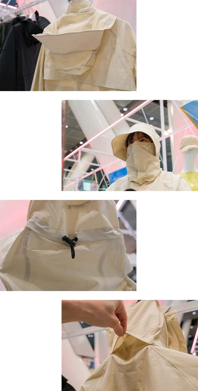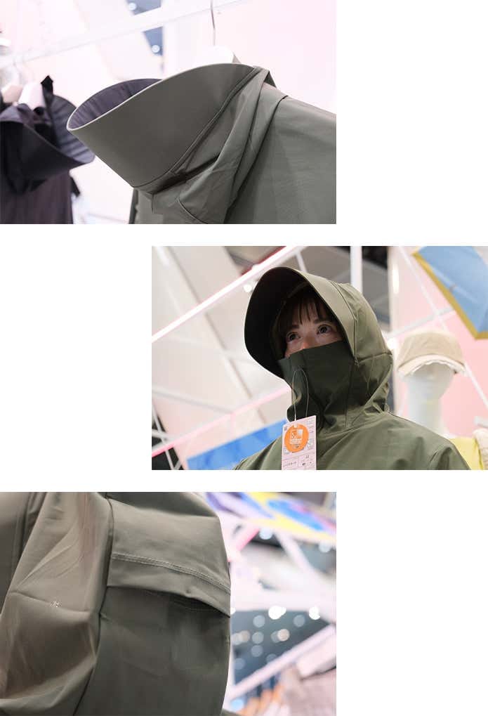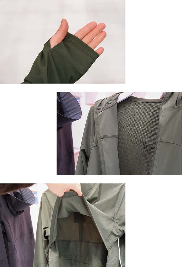 ツバ付きのフードが顔まわりをしっかりカバーし、日差しをガード。フード後部には髪を外に出せるホールがあり、着用時の快適さにも配慮されています。